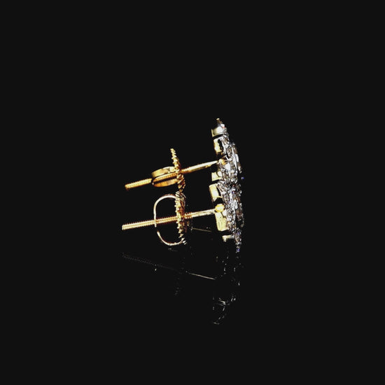 A beautiful and brilliant floral design, these diamond bloom studs are a stunning accessory for any occasion. Each earring features a central round diamond, which is then surrounded by a halo of six sparkling diamond 'petals'. The prong-set design allows for maximum light to enter each natural diamond, creating a look of exceptional fire and brilliance.